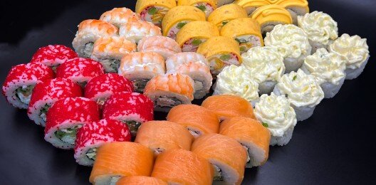 Ромео ,Филадельфия сырная ,королевский ,шеф ролл ,Аризона ,40 шт. Имбирь 2шт ,соевый 3шт ,васаби 30гр в комплекте .