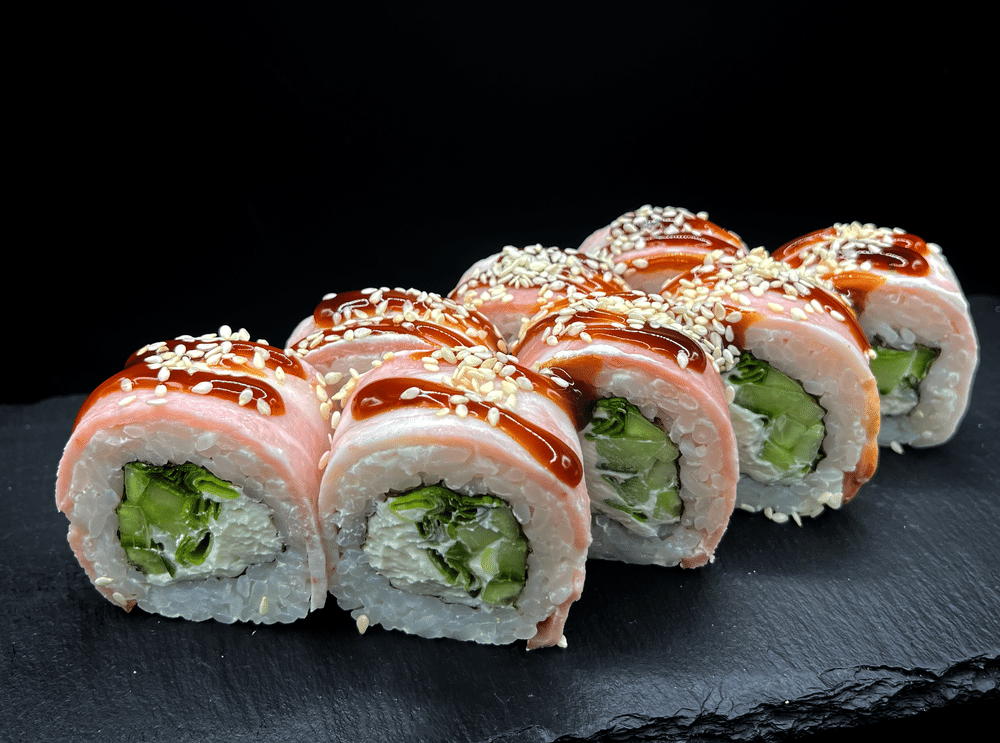 Сыр, Бекон, Огурец, Лук зелёный, Соус унаги, Кунжут.